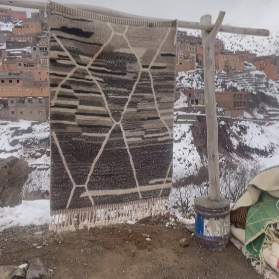 This authentic Beni Imlil rug is a handwoven Moroccan Berber piece made from 100% natural wool by skilled artisans in the Atlas Mountains. Featuring a modern abstract tribal pattern in earthy neutral tones, this rug blends traditional craftsmanship with contemporary design.