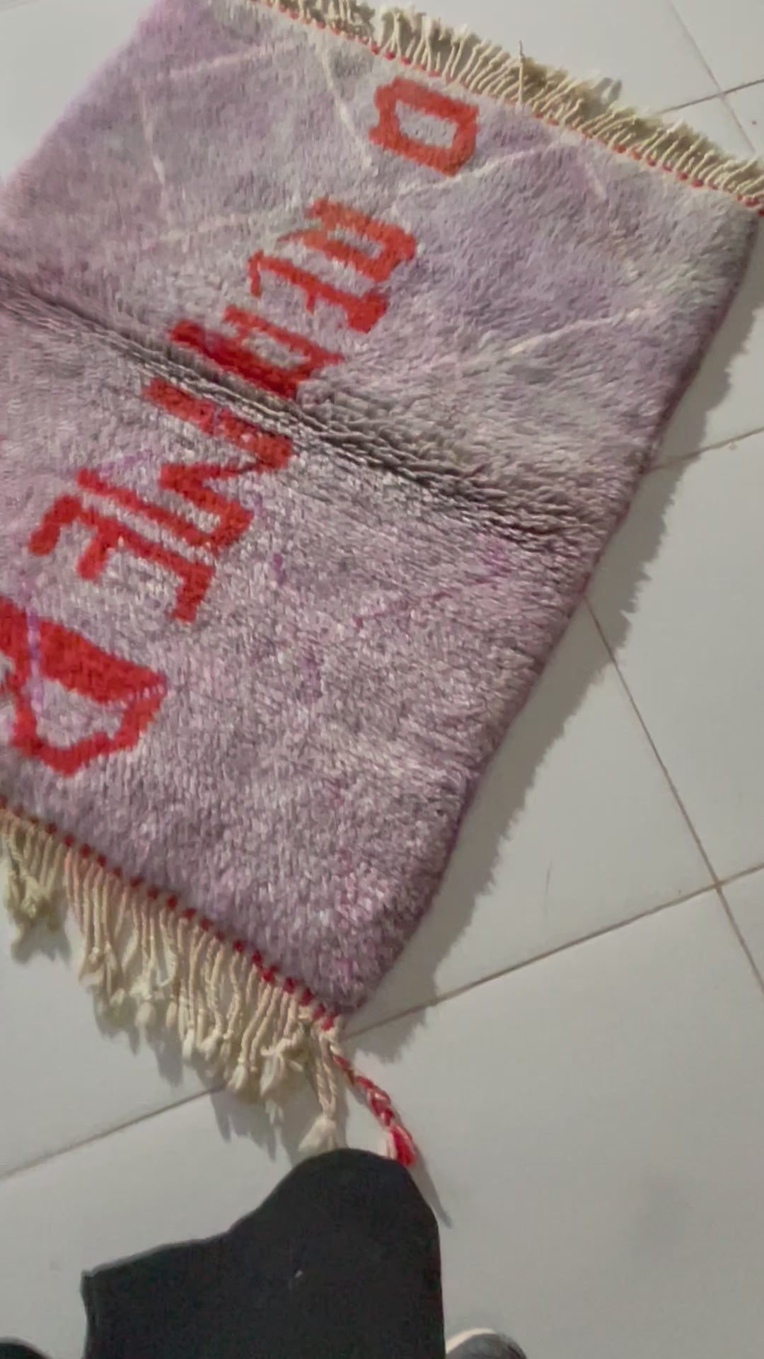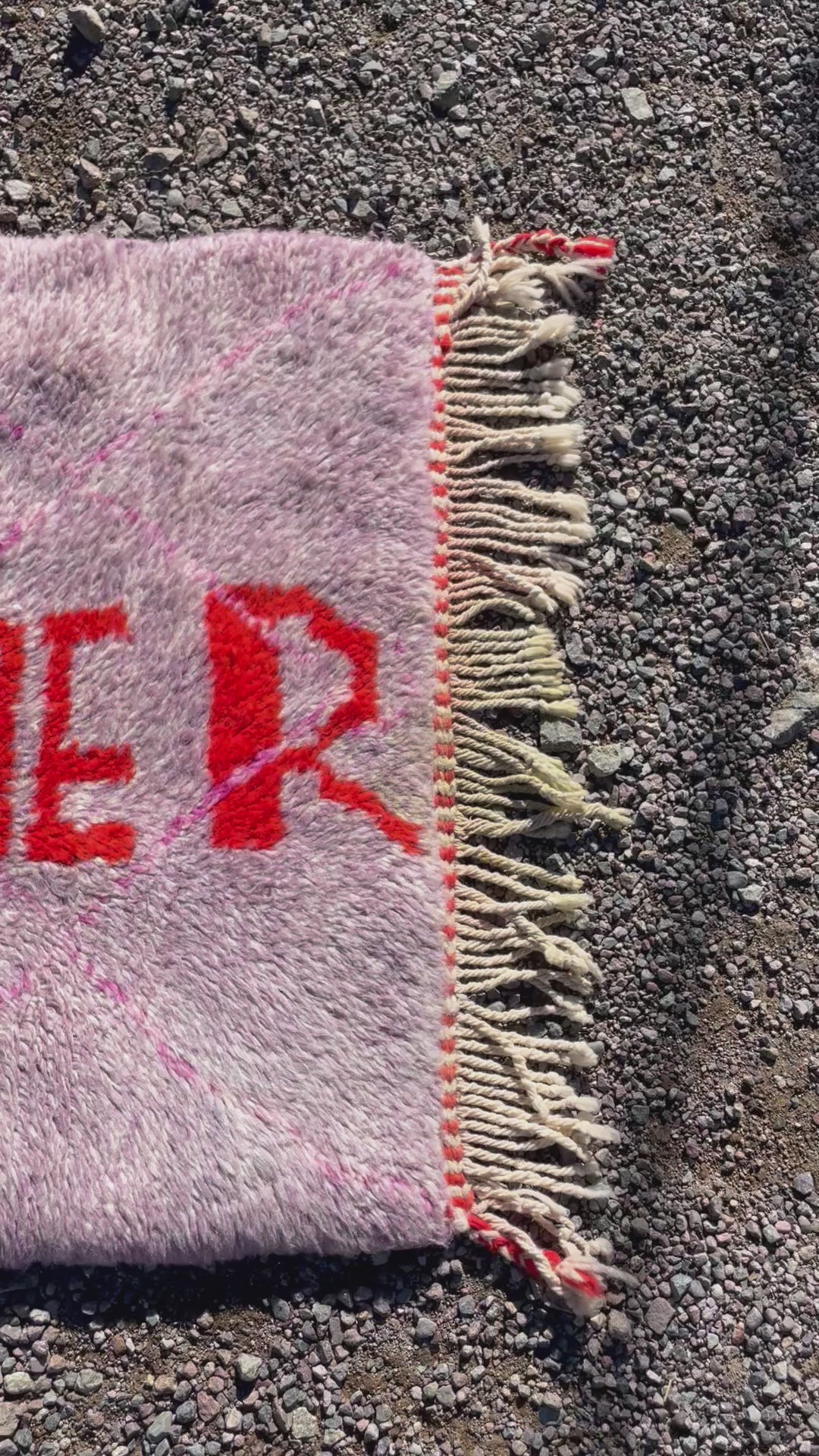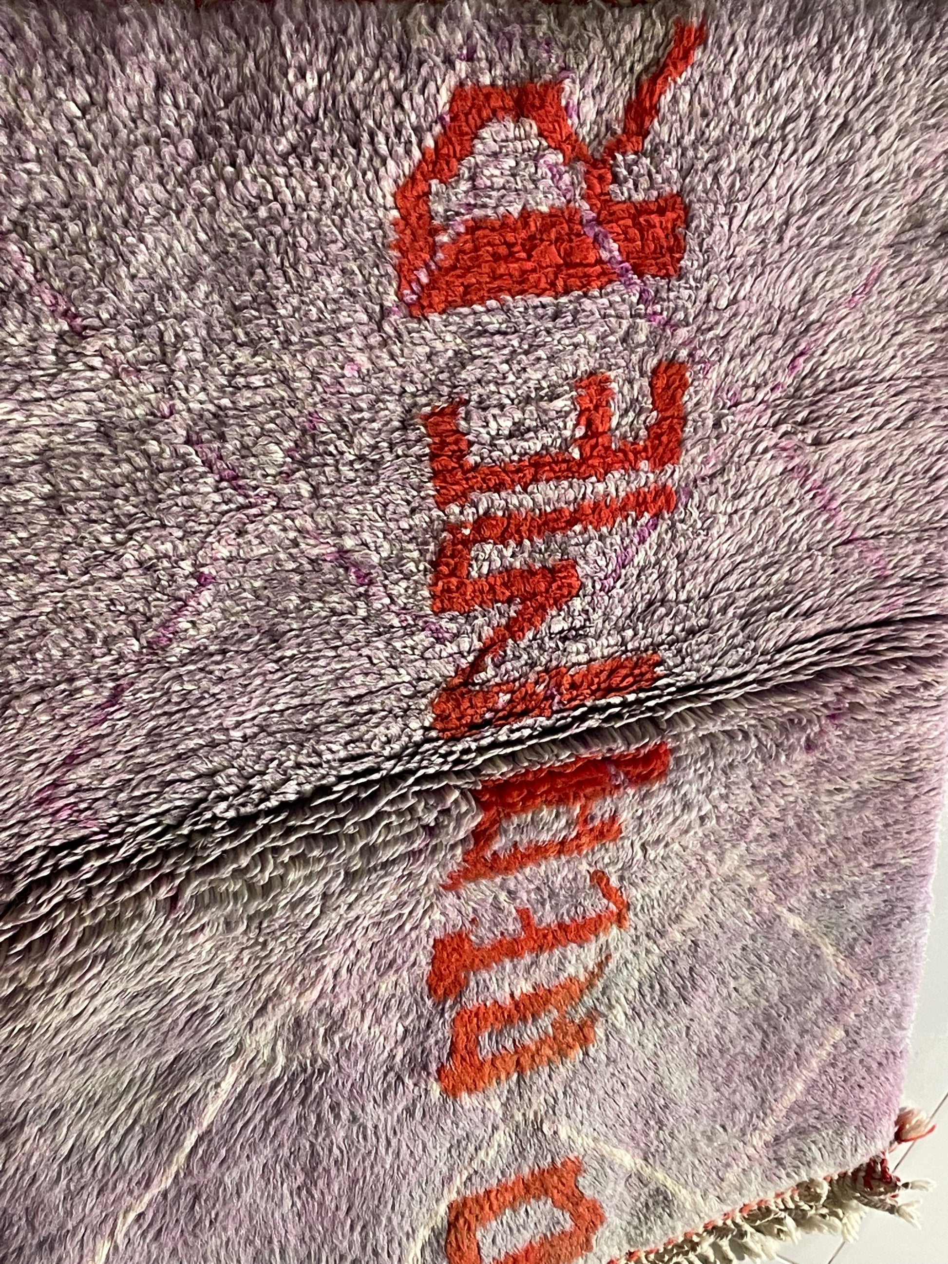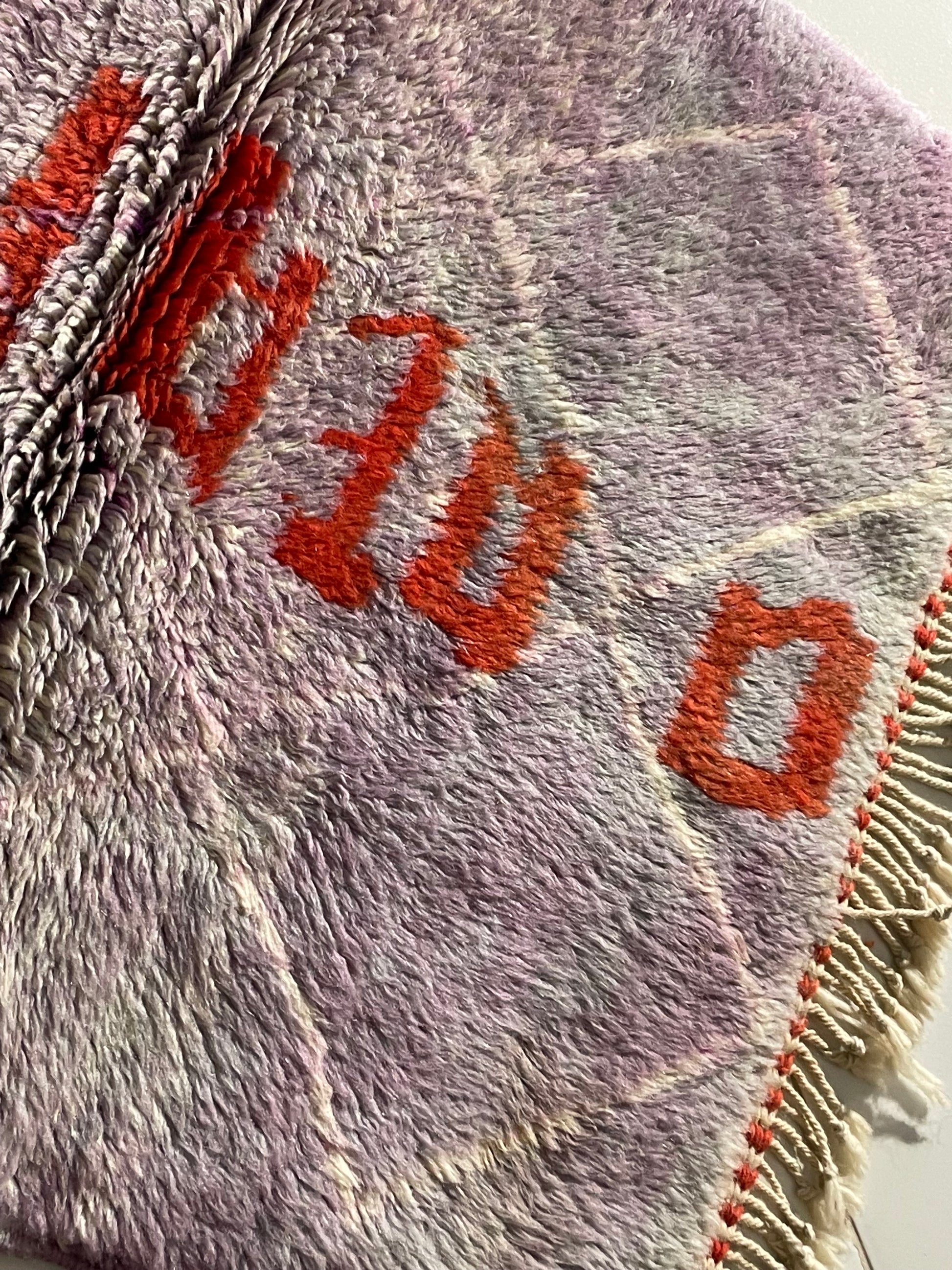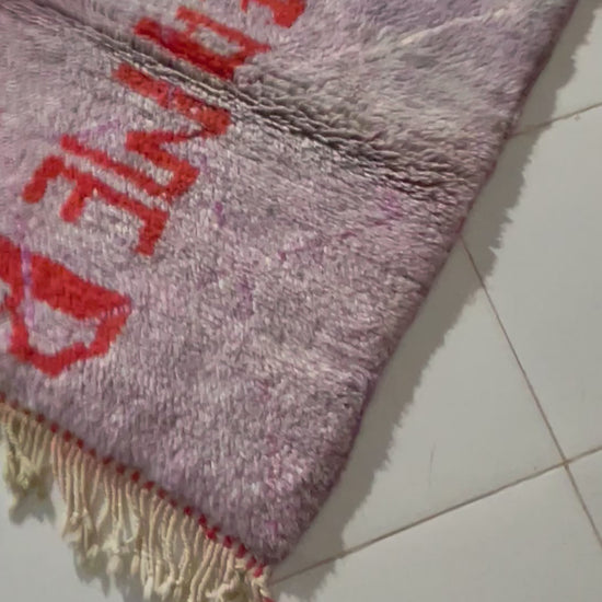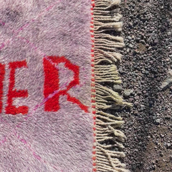 A handcrafted Moroccan wool rug created by Cooperative Adrar in the High Atlas Mountains. This piece features a soft lilac-pink toned background with bold orange “DREAMER” lettering, giving it a vibrant and uplifting artistic touch. Made using traditional Berber weaving techniques, it’s perfect as a wall hanging, studio accent, or decorative small rug.