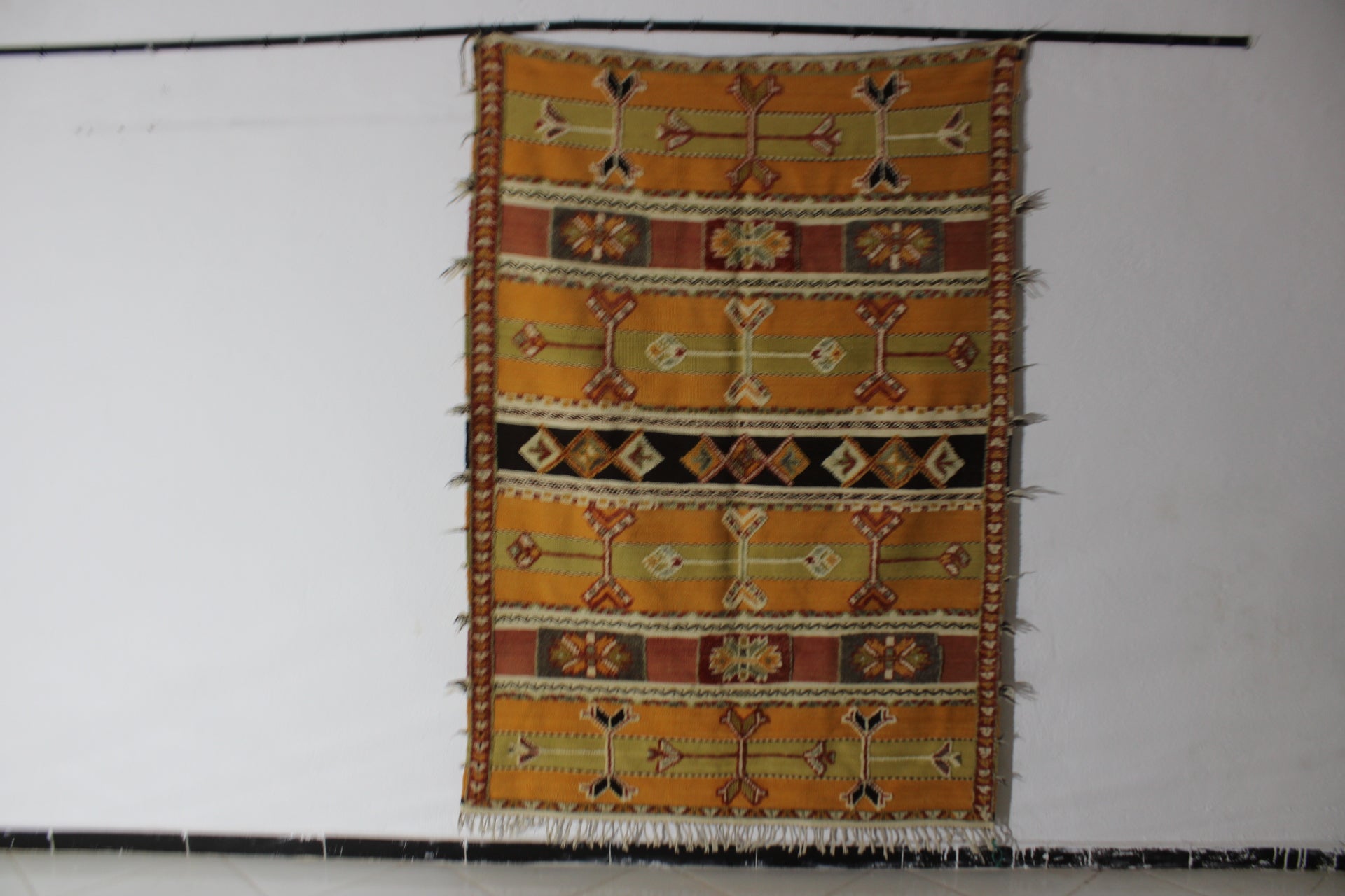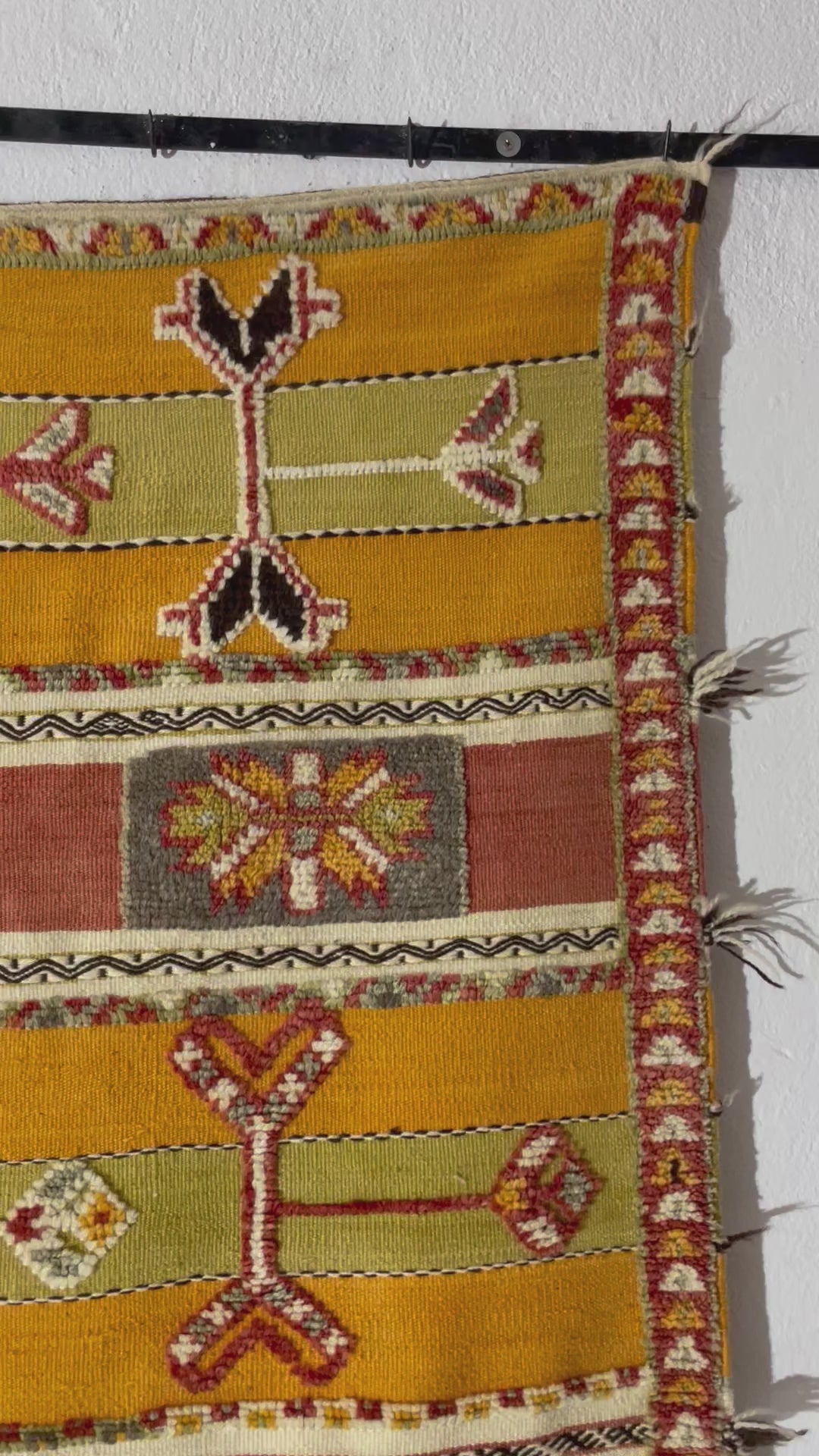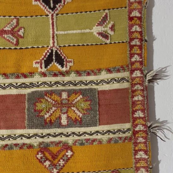 Made using the traditional Glaoui weaving technique — a mix of flatweave, knotted pile, and embroidery — this piece brings rich Berber symbolism and warm desert colors into your home.