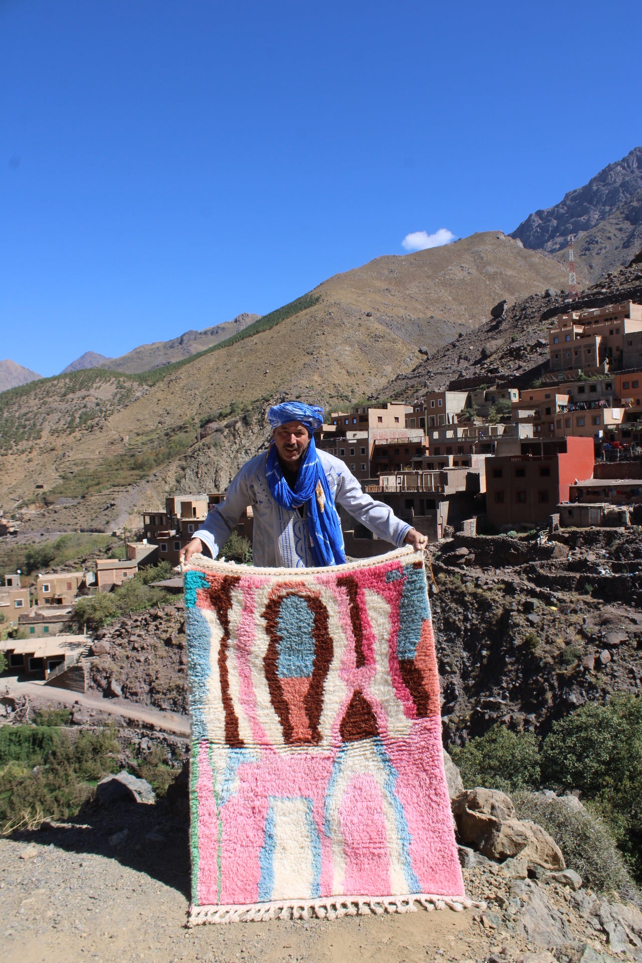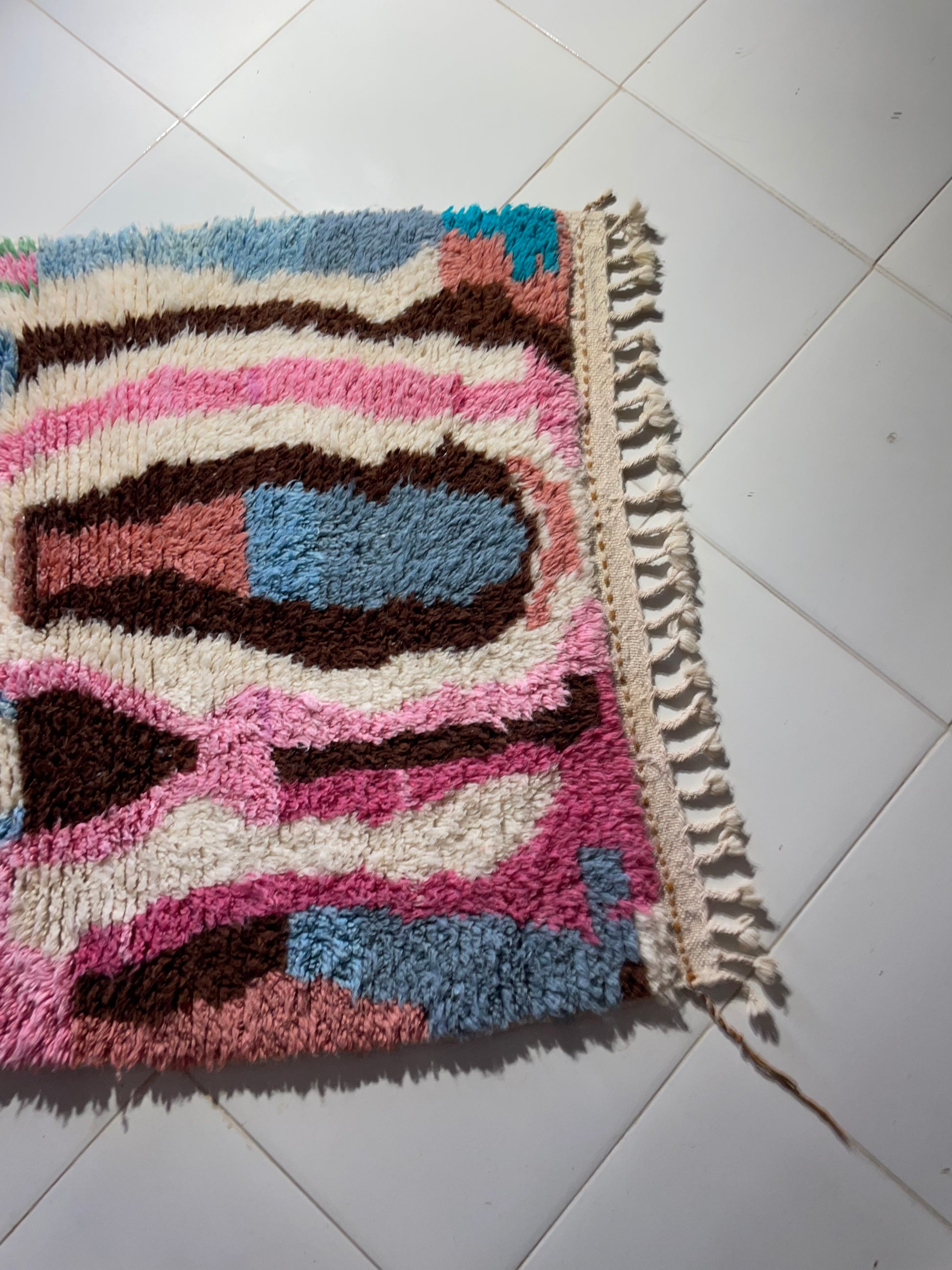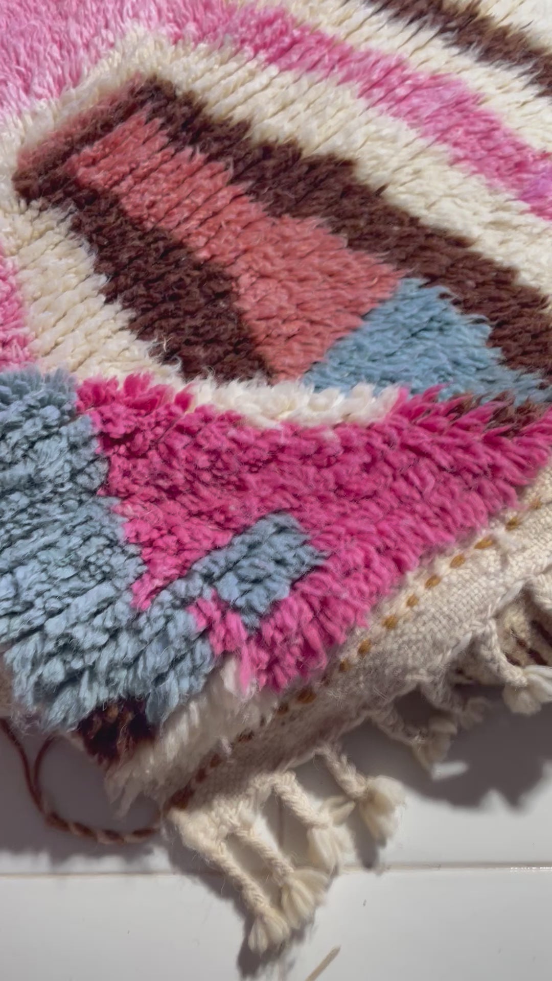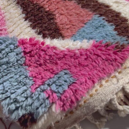 A traditional Moroccan Azilal rug handwoven from pure wool. Its unique tribal patterns and warm tones add character and depth to any interior. The perfect size for accenting small areas or layering with larger rugs.