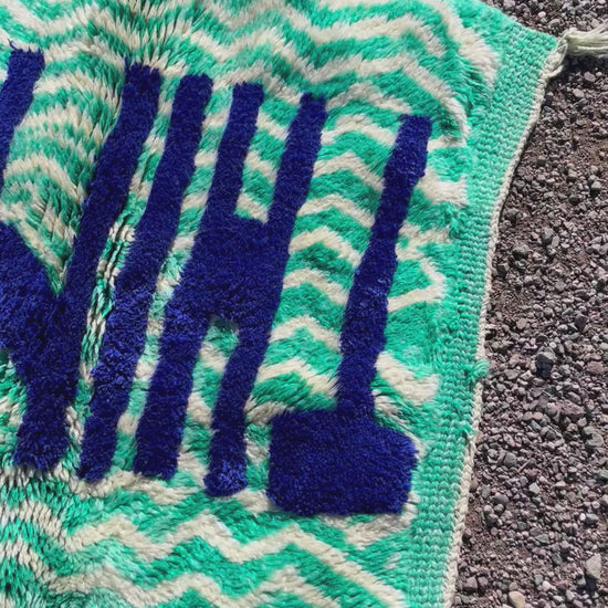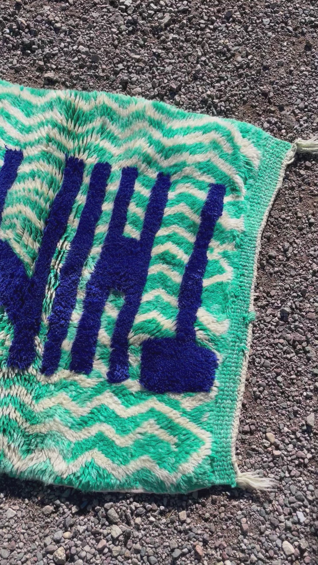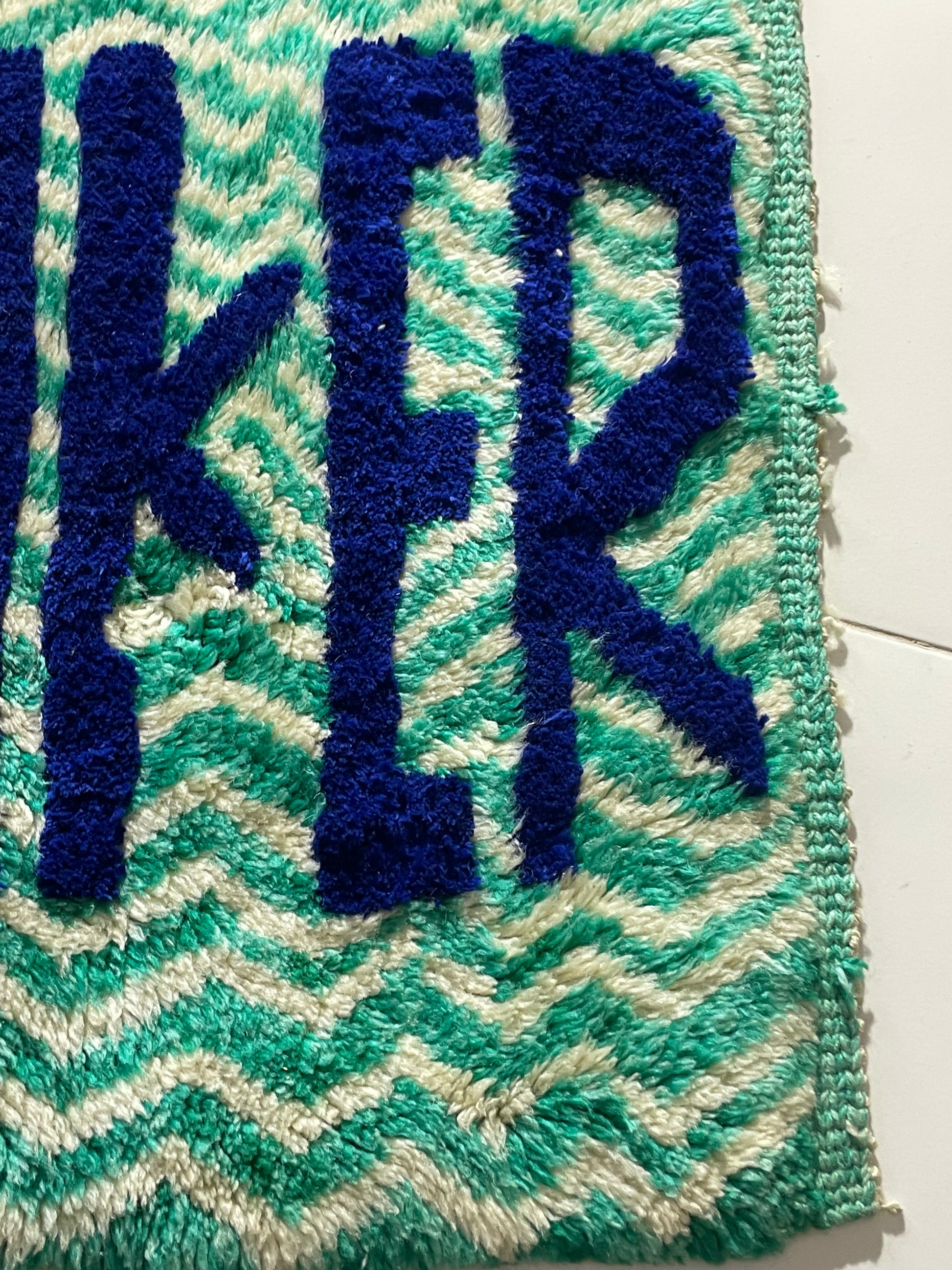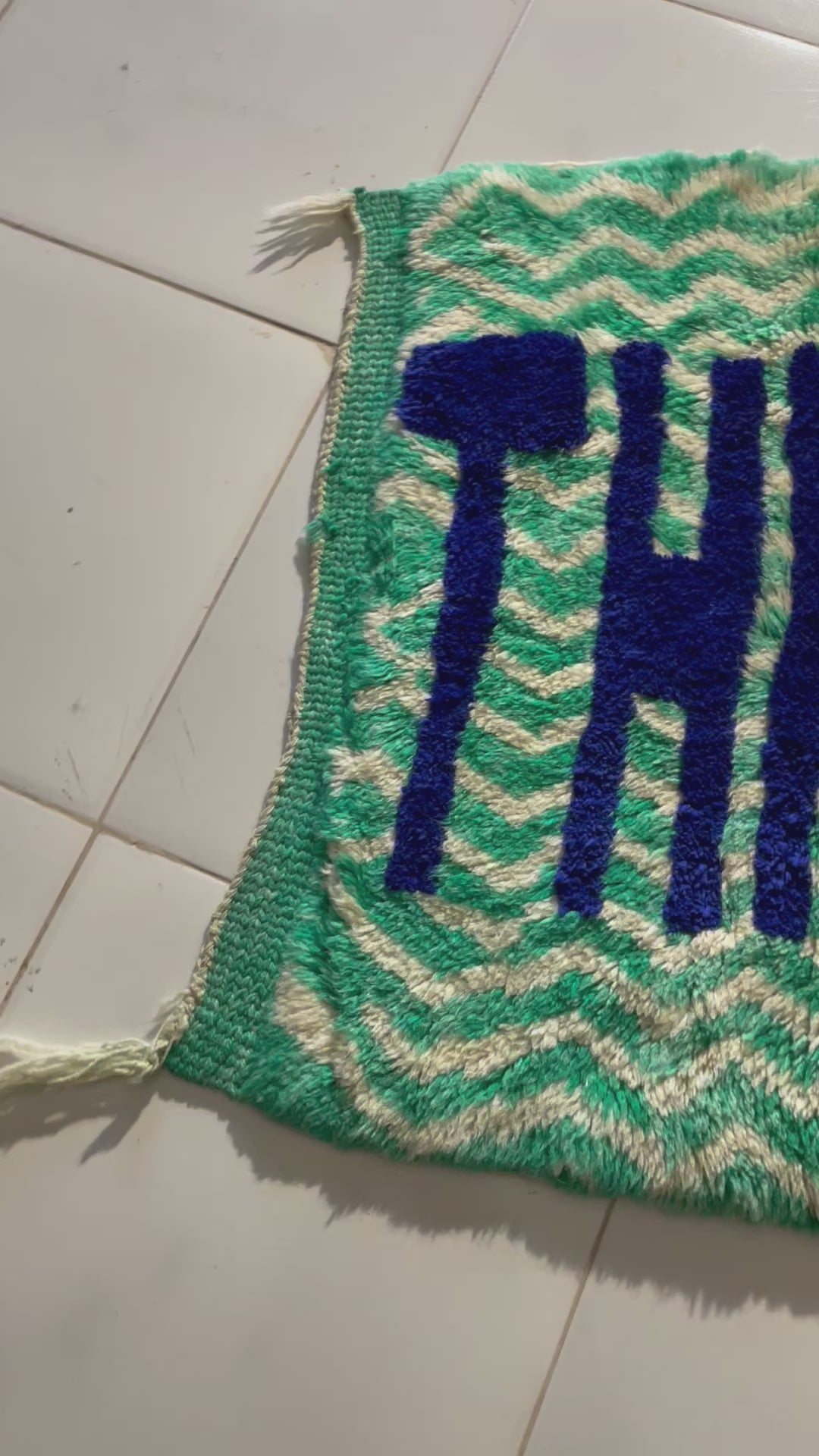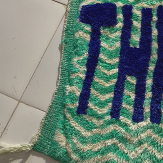 A handcrafted Moroccan wool rug made by Cooperative Adrar in the High Atlas Mountains. This piece features a soft green textured surface with bold blue “THINKER” lettering, creating a modern artistic look while staying true to traditional Berber weaving techniques. Perfect as a wall hanging, studio accent, or small decorative rug.