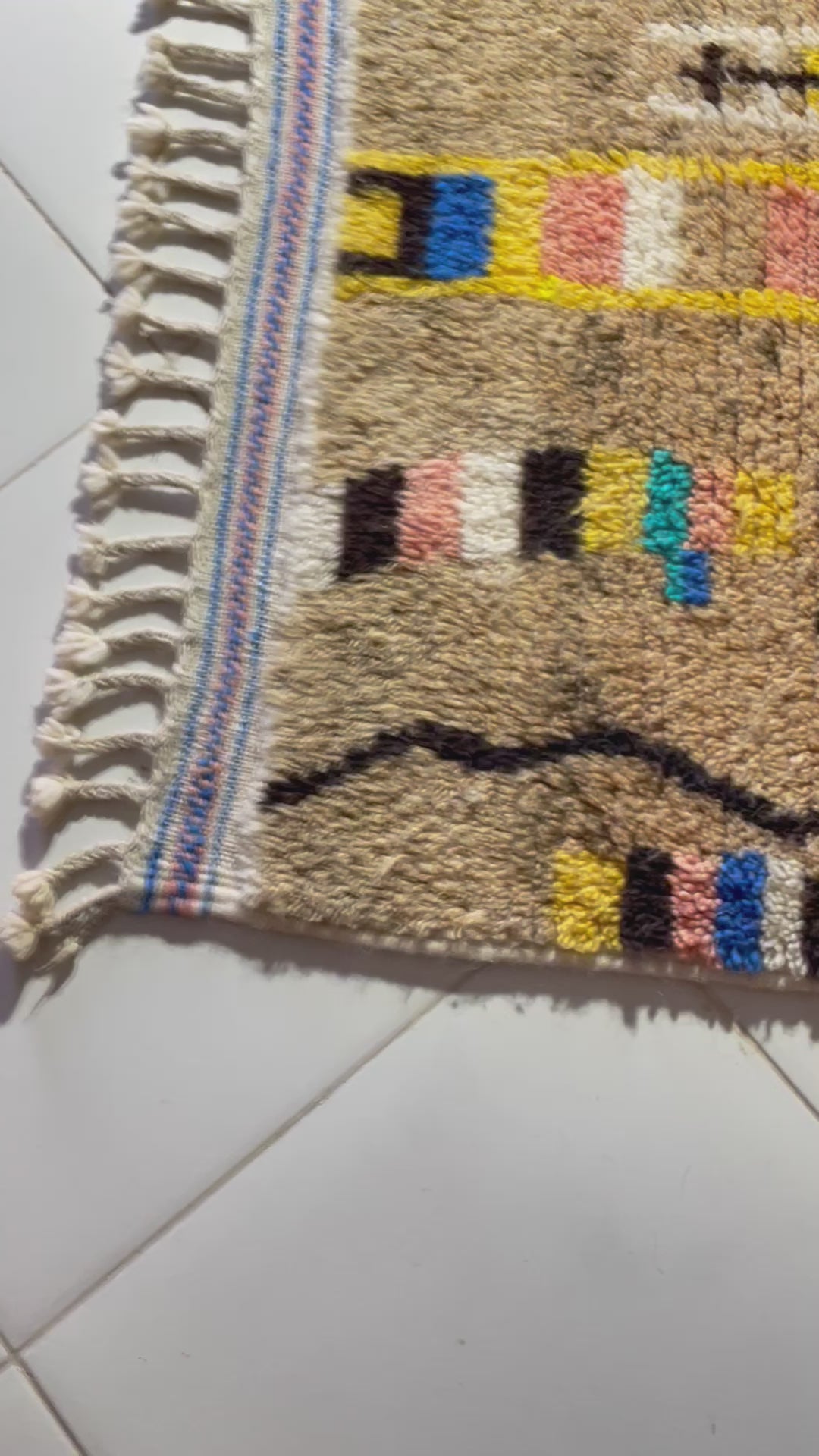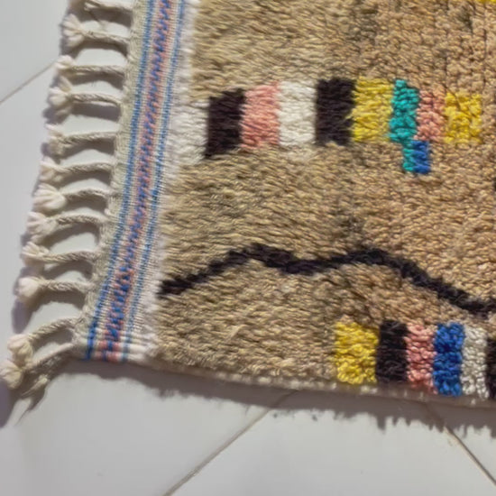 Soft, natural, and full of character — this Azilal rug is handwoven from fine Moroccan wool and showcases the colorful geometric spirit of Berber craftsmanship. Ideal for bohemian or minimalist interiors.